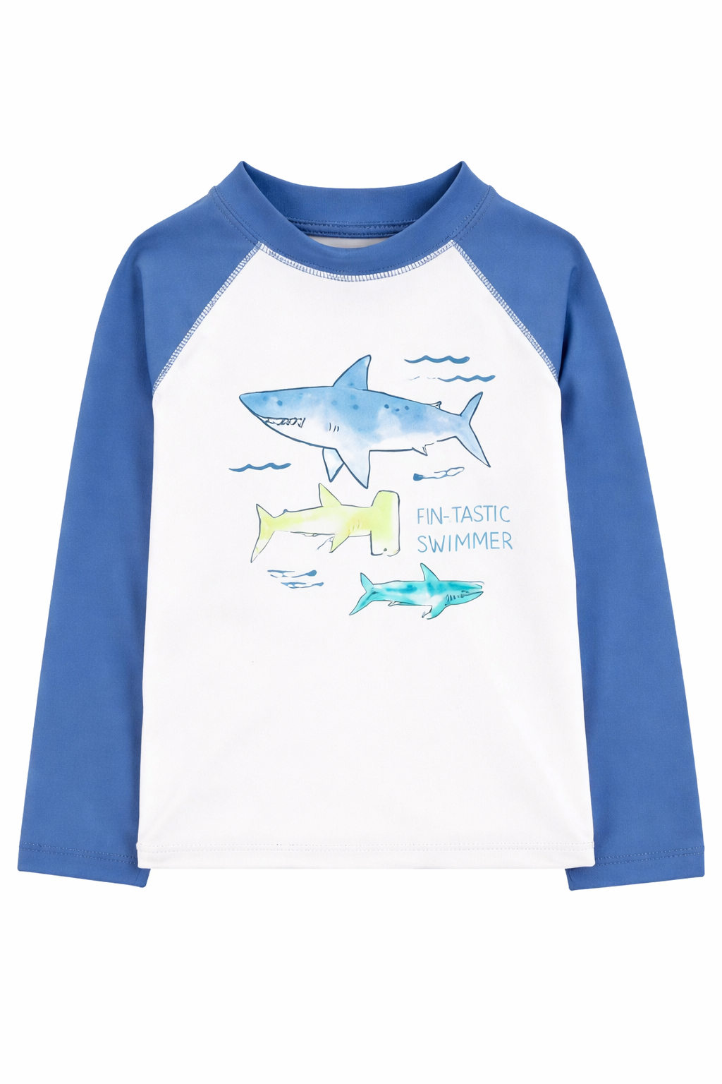A camiseta de manga longa apresenta as cores branca e azul, com uma estampa divertida de tubarão (verifique o produto exato), que os meninos adoram. O tecido é leve e de secagem rápida, ideal para atividades aquáticas. (Verifique se o produto possui etiqueta UV Protection, se sim, adicione a informação abaixo).