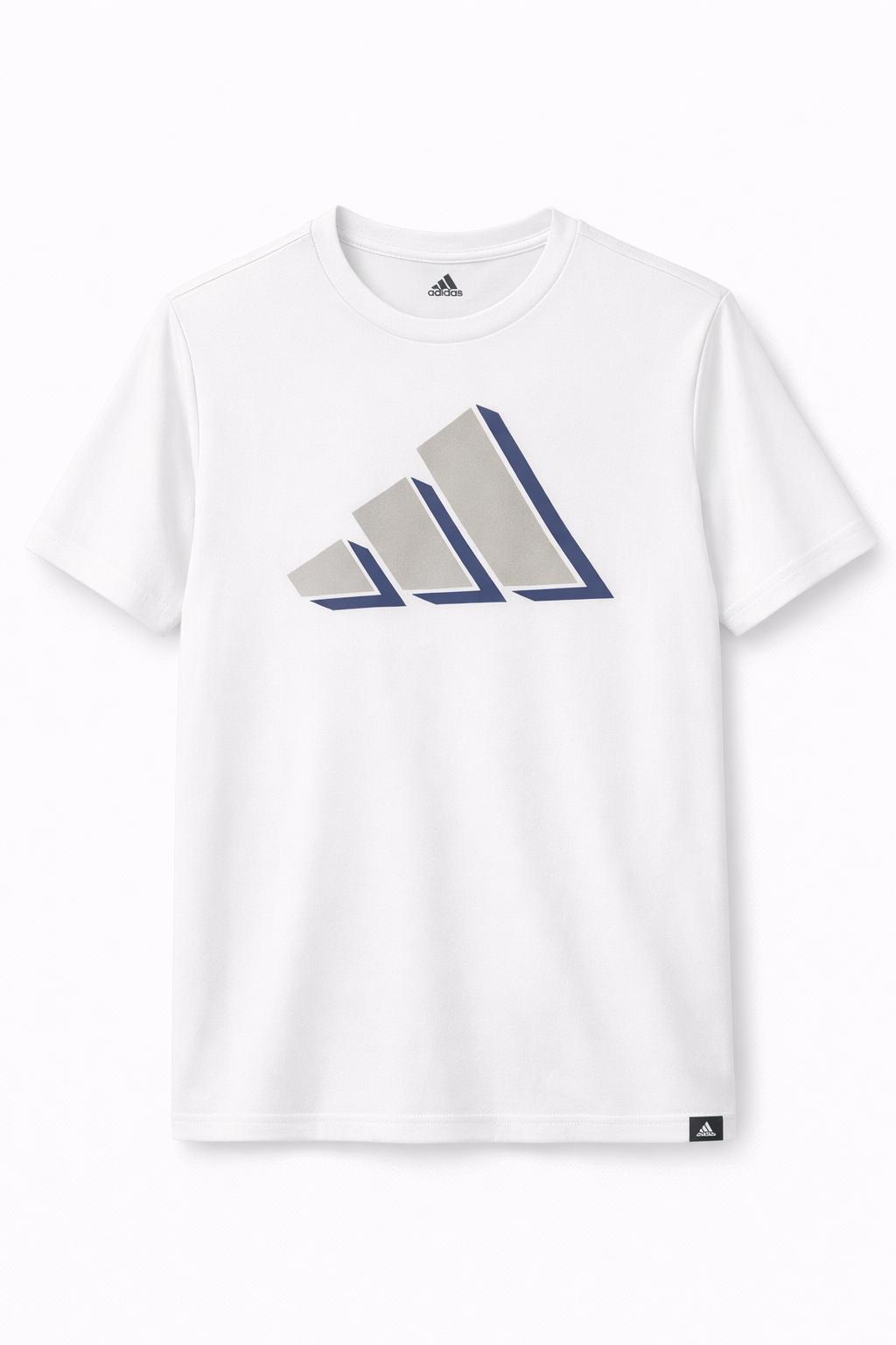 Camiseta Infantil Menino Adidas Dry Fit Branca Logo Bege e Azul