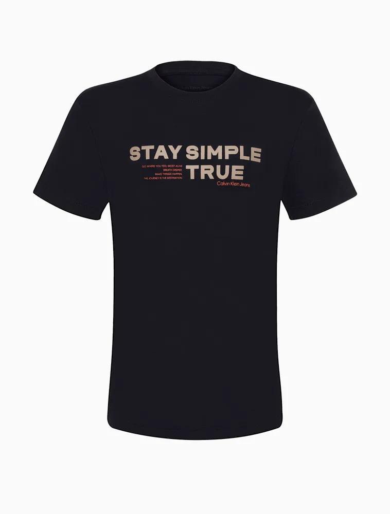 Apresentamos a camiseta perfeita para os meninos que gostam de se vestir com atitude e qualidade, da aclamada marca global Calvin Klein. Esta peça combina o conforto e a durabilidade que os pais confiam com um design minimalista, moderno e com a estampa exclusiva "Stay Simple True".
