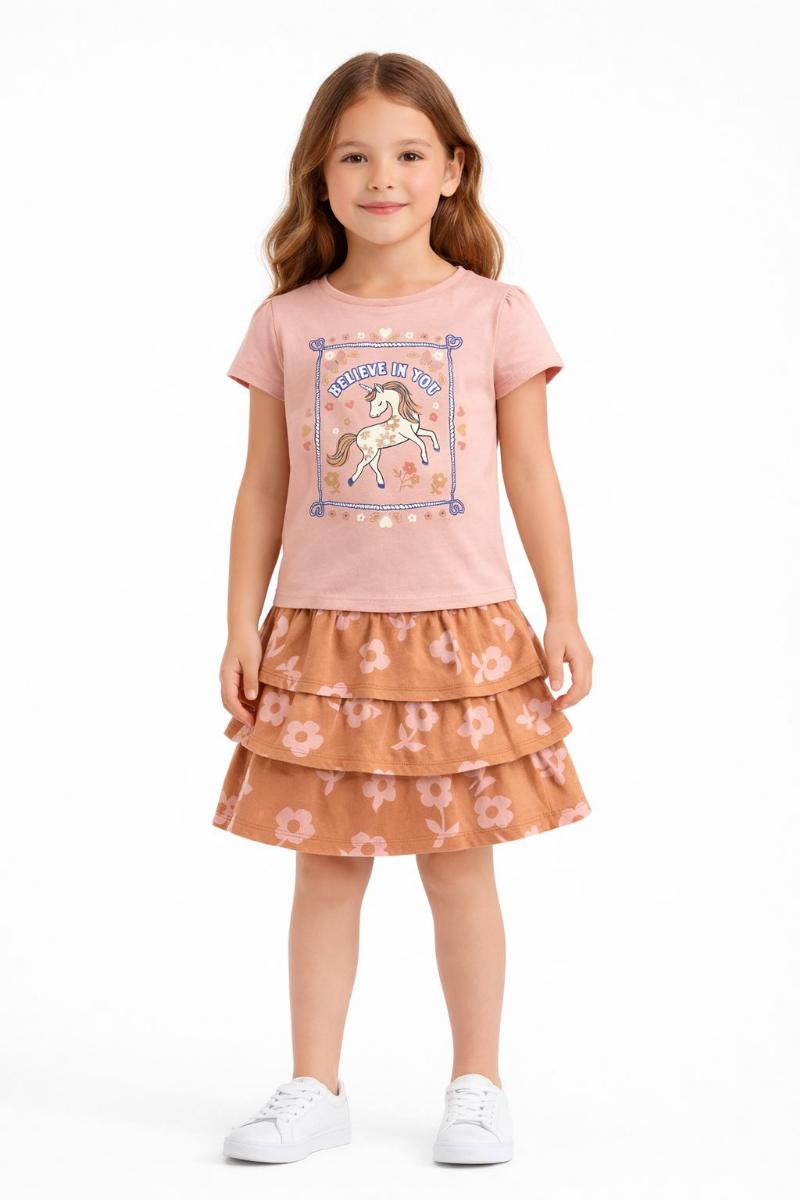 A camiseta é confeccionada em algodão de alta qualidade, garantindo que a pele da sua filha respire durante as brincadeiras. A saia floral marrom adiciona um toque de estilo "mocinha", perfeita para passeios, festas de aniversário ou fotos em família. Por ser um produto importado, ele conta com acabamentos reforçados e um caimento que você só encontra no padrão americano de moda infantil. É a exclusividade que sua pequena merece com a praticidade que sua rotina pede!