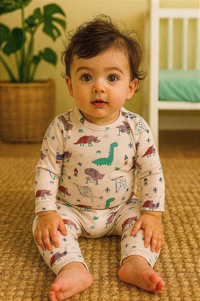 01 Body Manga Curta: Na cor bege com estampa temática de dinossauros.