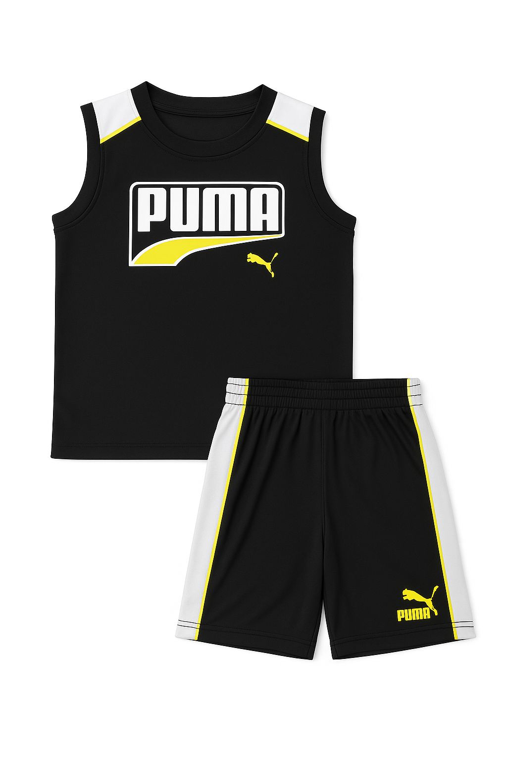 conjunto infantil puma, conjunto puma menino, conjunto esportivo infantil, conjunto 2 peças puma, regata infantil puma, bermuda preta dry fit, roupa esportiva importada, moda infantil puma, roupas puma kids originais, presente infantil puma