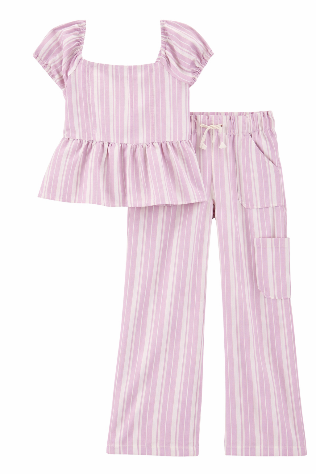 Este conjunto é perfeito para passeios ao ar livre, festas de aniversário ou um dia de diversão. A estampa listrada traz delicadeza, enquanto a calça lilás mantém a praticidade necessária para a hora da brincadeira.