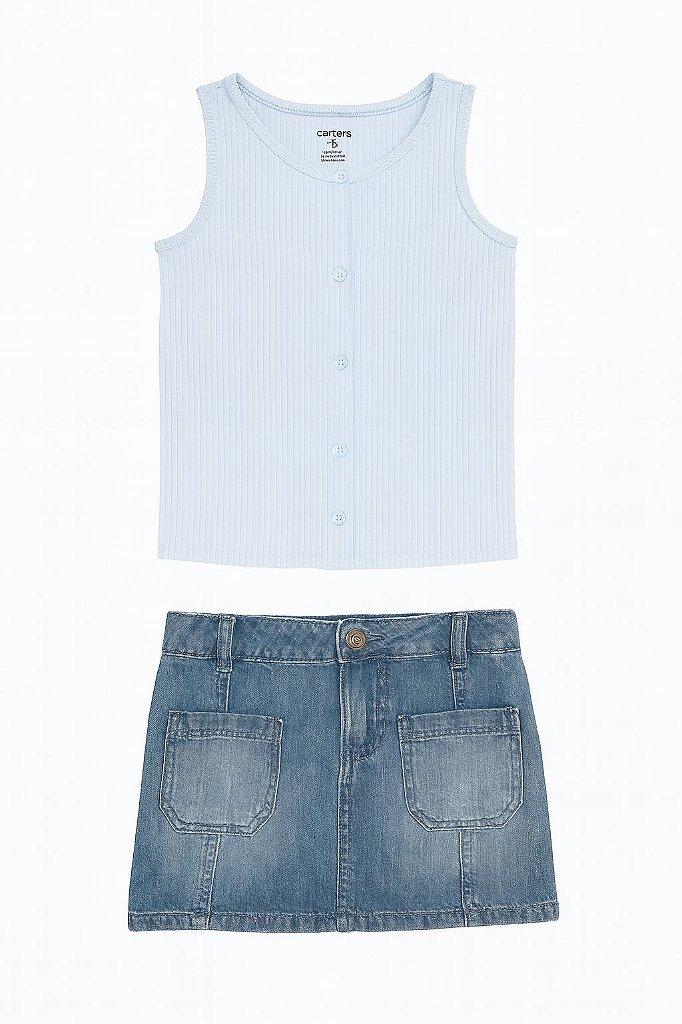 A regata na cor azul oferece um toque suave à pele, com modelagem que permite total ventilação e movimento. A saia jeans complementa o visual com um toque moderno, possuindo lavagem clássica que combina com qualquer calçado, desde tênis casuais até sandálias delicadas.