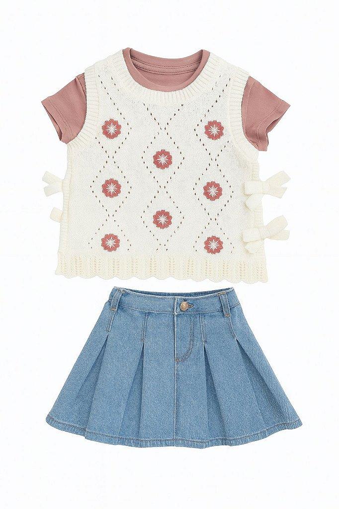 Apresentamos o conjunto que une a delicadeza do tricot com a atitude do jeans. Este kit exclusivo de 2 peças (colete e saia) da renomada designer Cynthia Rowley é a escolha perfeita para garantir que sua filha esteja sempre na moda, com um visual arrumado, confortável e cheio de personalidade.