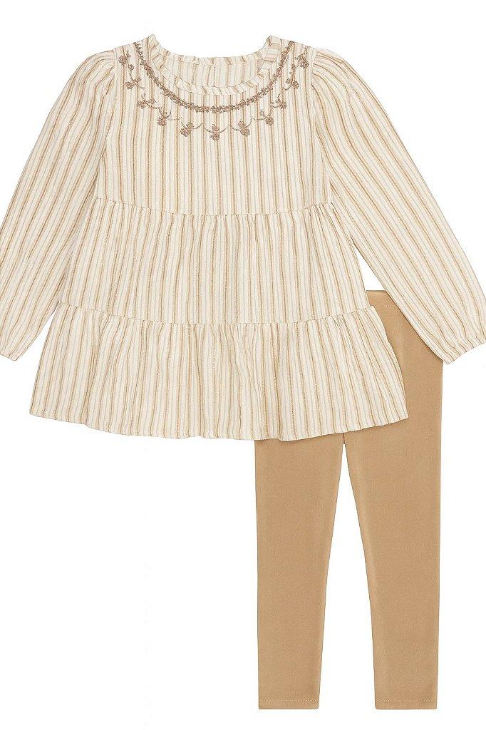 A bata listrada oferece um toque suave à pele, com modelagem leve e detalhes de bordado delicado que evocam o estilo autêntico da Lucky Brand. Acompanha uma legging (assumindo uma cor que combine, ex: azul marinho, branca ou jeans, ajuste se souber a cor exata) que complementa o visual com um toque moderno e super confortável.