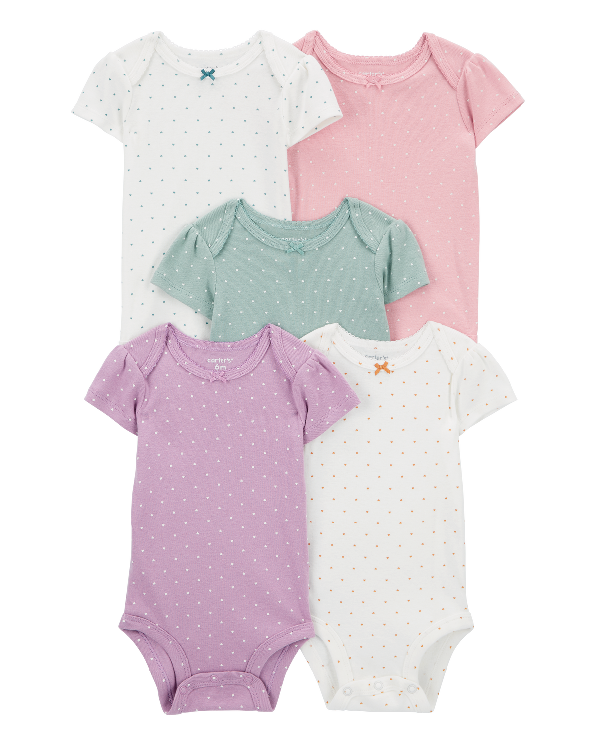 O Kit 5 Bodys Manga Curta Cores Neutras Menina Carter’s com Estampa de Corações traz a combinação perfeita de conforto, estilo e praticidade. Produzidos em 100% algodão macio e respirável, garantem bem-estar durante todo o dia, além de facilitar a troca com seus botões de pressão reforçados.
