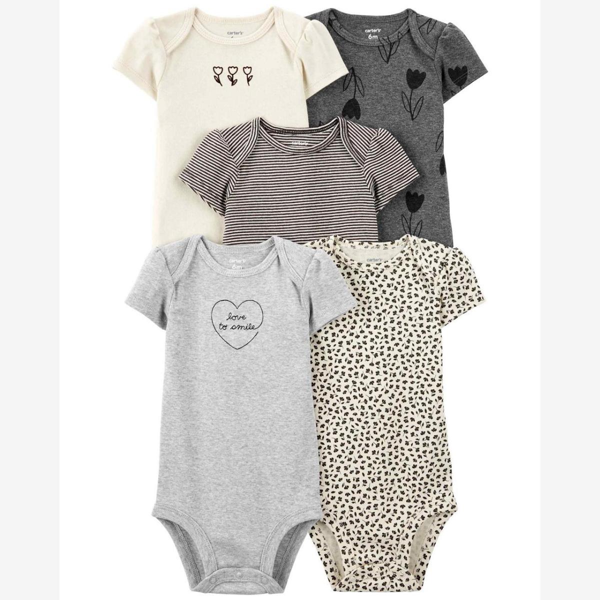 Se você é uma mãe que ama um estilo moderno e quer fugir do "rosa total", o Kit 5 Bodies Carter's Preto, Bege e Cinza Floral foi feito para você. Com uma paleta de cores neutras e elegantes, este kit permite criar combinações incríveis com qualquer calça ou shorts, deixando sua bebê sempre com aquele ar de "arrumadinha" sem esforço.