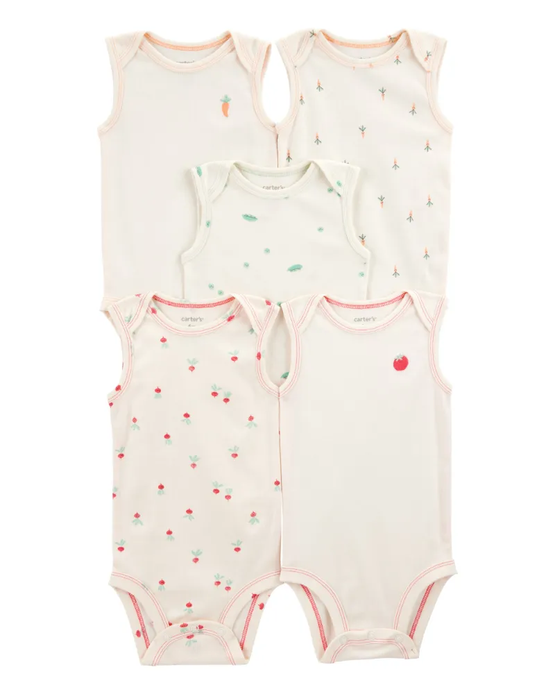 O Kit 5 Bodys Regata Estampa Legumes Carter’s é a escolha perfeita para os dias mais quentes, trazendo leveza, conforto e diversão ao enxoval do bebê. Confeccionados em 100% algodão macio e respirável, oferecem suavidade ao toque e liberdade total de movimentos.