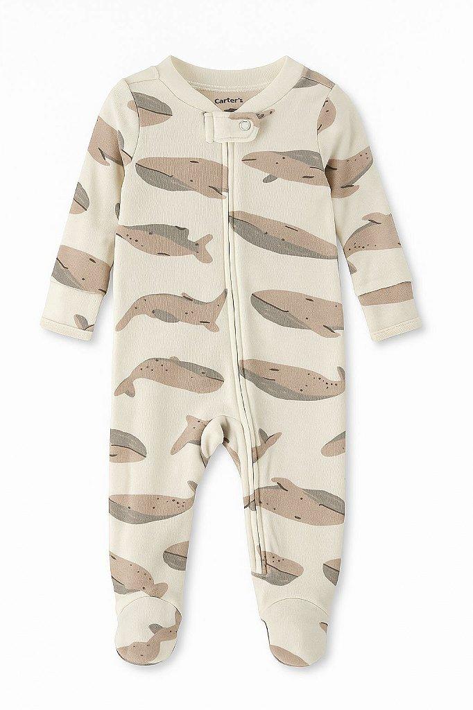 01 Macacão Infantil Menino Bege Baleia Algodão