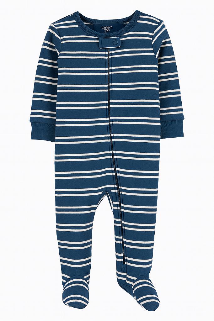 Com design clássico em listras azul marinho, é uma peça versátil e moderna que combina facilmente com o enxoval. O modelo conta com zíper frontal prático, que facilita na hora de vestir e trocar, além de pezinho fechado para manter o bebê sempre aquecido.