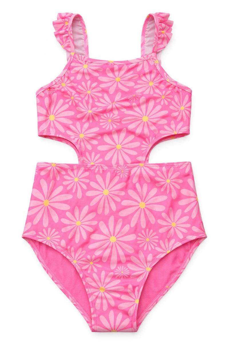 A combinação do rosa vibrante com as flores brancas cria um contraste solar e fotogênico, perfeito para registrar os melhores momentos em família. As alças são projetadas para ficarem no lugar, permitindo que sua menina nade, corra e brinque com total liberdade e segurança.