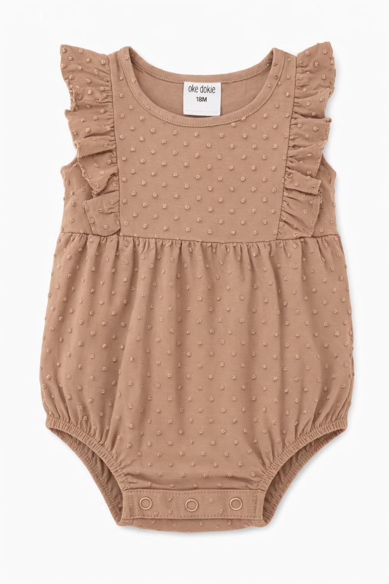 Se você ama o estilo "Clean e Natural" para sua princesa, o Romper Okie Dokie Bege Poá é a escolha definitiva. Fugindo dos tons óbvios, o bege traz uma sofisticação discreta que, combinada com a estampa de bolinhas branca, cria um visual atemporal e muito elegante.