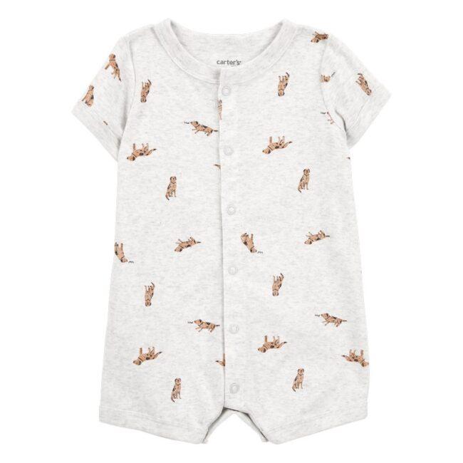 Para as mamães que amam um visual moderno e versátil, o Romper Carter?s Cinza com Estampa de Cachorrinho é a peça que une a sofisticação do cinza mescla com a alegria do mundo infantil. É o look perfeito para aquele passeio no parque ou para receber visitas em casa com muito estilo.