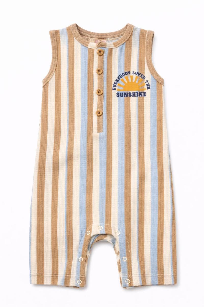 Este romper é original e importado dos EUA, trazendo a qualidade da Okie Dokie, conhecida por suas malhas de algodão que abraçam a pele do bebê. As listras clássicas ganham um toque moderno com a estampa "Sunshine", evocando aquela vibe alegre de férias e passeio ao ar livre.