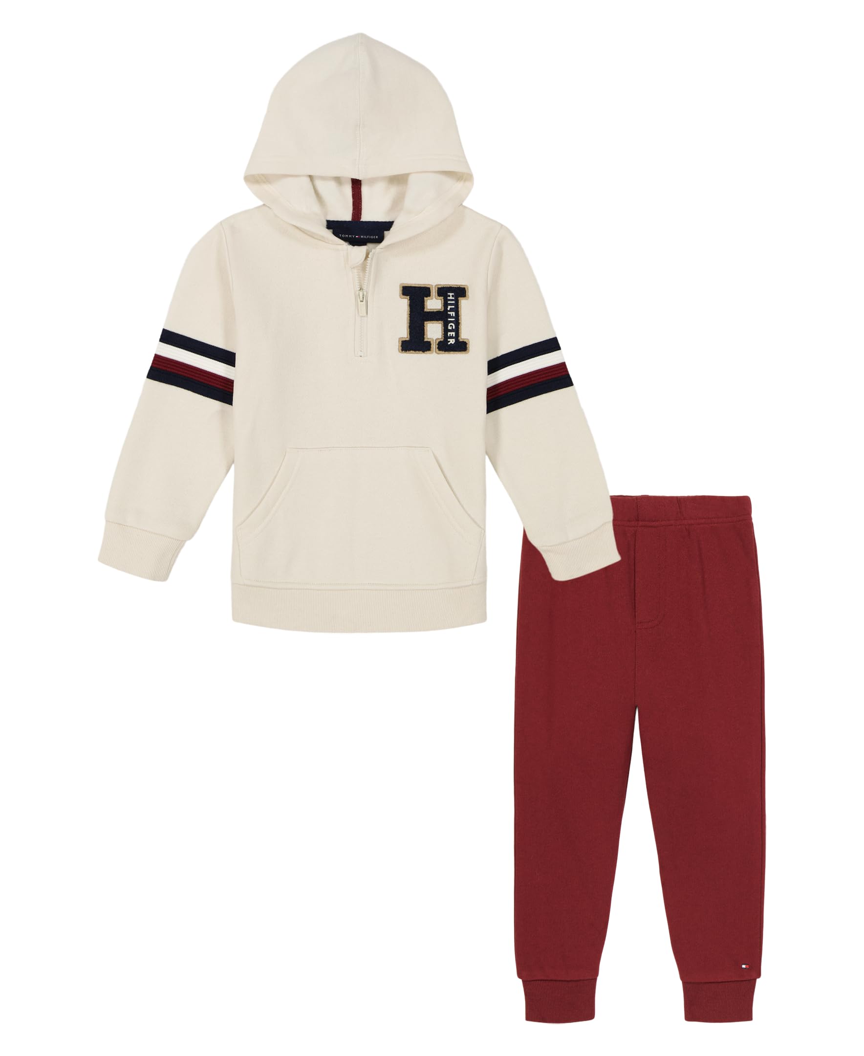 Acompanha um moletom bege com logo Tommy bordado e uma calça bordô com ajuste na cintura, ambos em tecido macio e ideal para o inverno ou meia-estação.